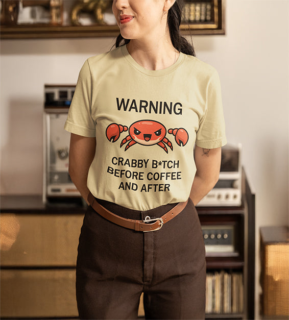 Funny Crabby Coffee Mood T-Shirt – “Warning: Crabby Before Coffee and After”From $19.99